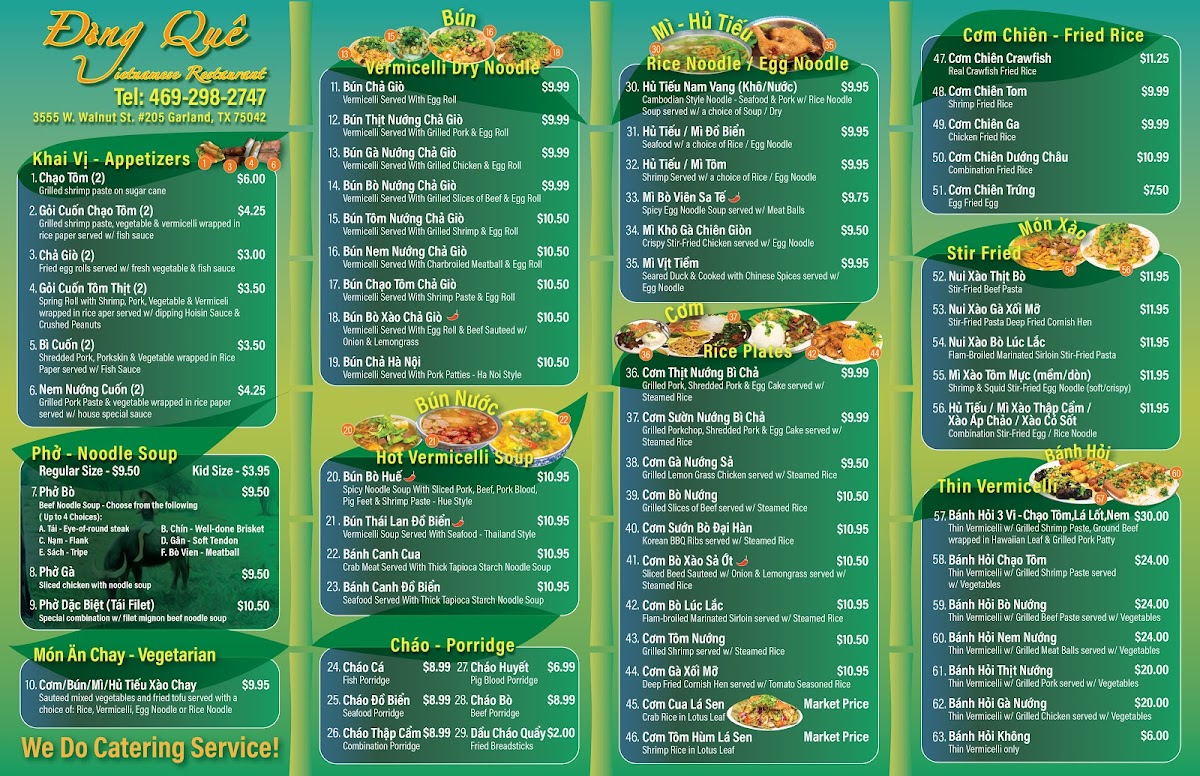 Welcome to Đồng Quê Restaurant, a hidden gem in Garland, TX, where authentic Vietnamese flavors come alive. Renowned for its generous portions and delectable dishes, this eatery specializes in a variety of traditional meals that cater to every palate. The standout is their celebrated Seven Beef Dish, perfect for families and groups, offering incredible value with servings that can easily feed four to six people.